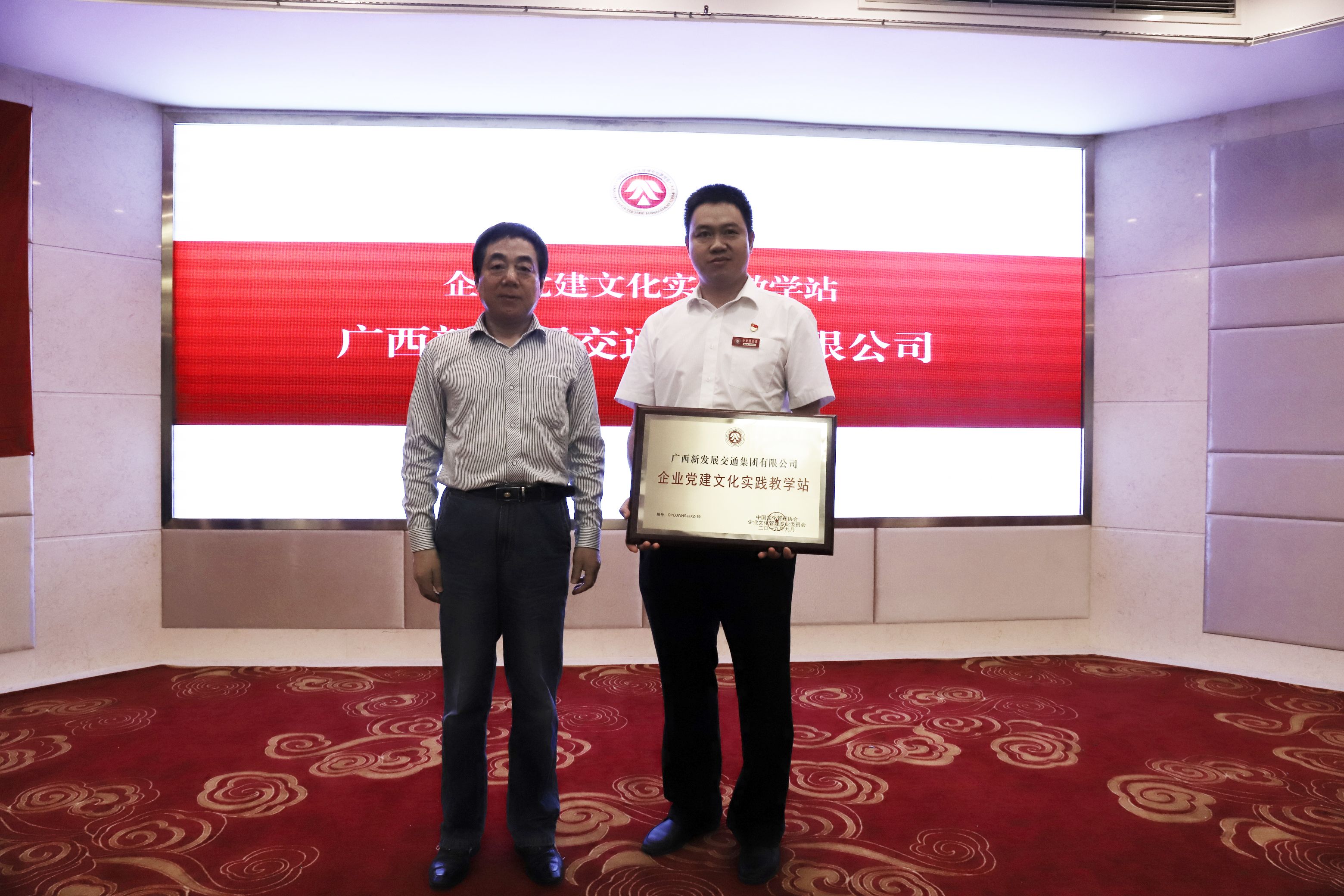 圖2:今年9月,黨建網(wǎng)執(zhí)行副總裁張國樑(左)為我公司頒發(fā)“企業(yè)黨建文化實(shí)踐教學(xué)站”牌匾。公司黨委書記、董事長賴水平(右)代表公司領(lǐng)獎(jiǎng)